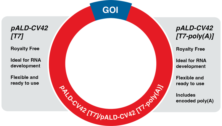 Aldevron now offers pALD-CV42 [T7] and pALD-CV42 [T7-PolyA]. These cloning backbones contain the T7 promoter region for RNA production, with an option for encoded poly(A) available in one construct.