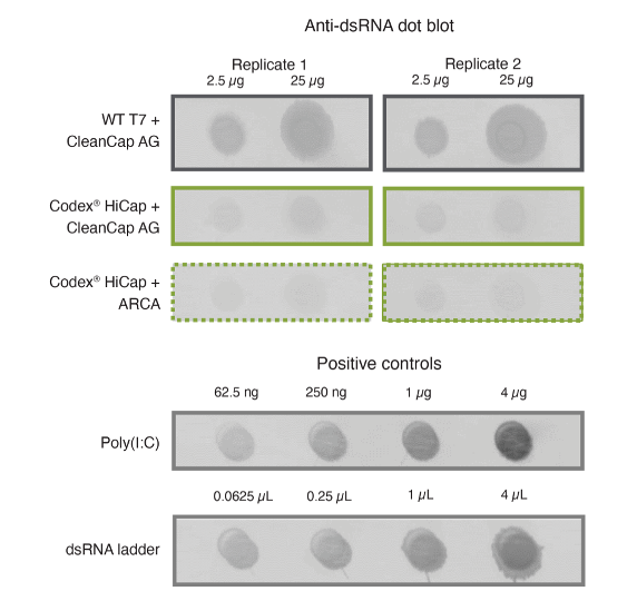 Using Codex HiCap enzyme in our research grade mRNA production generates fewer undesirable dsRNA byproducts than WT T7 RNA polymerase, reducing unwanted immunogenicity and efficiently incorporating commercially available cap analogs. The result is a superior production of pure RNA for our clients at no additional cost.