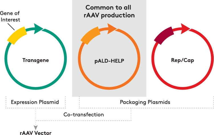 Triple transfection is the most common method for rAAV production and does not require co-infection with adenovirus; a helper plasmid provides adenoviral genes. Aldevron's pALD-HELP has several advantages:
